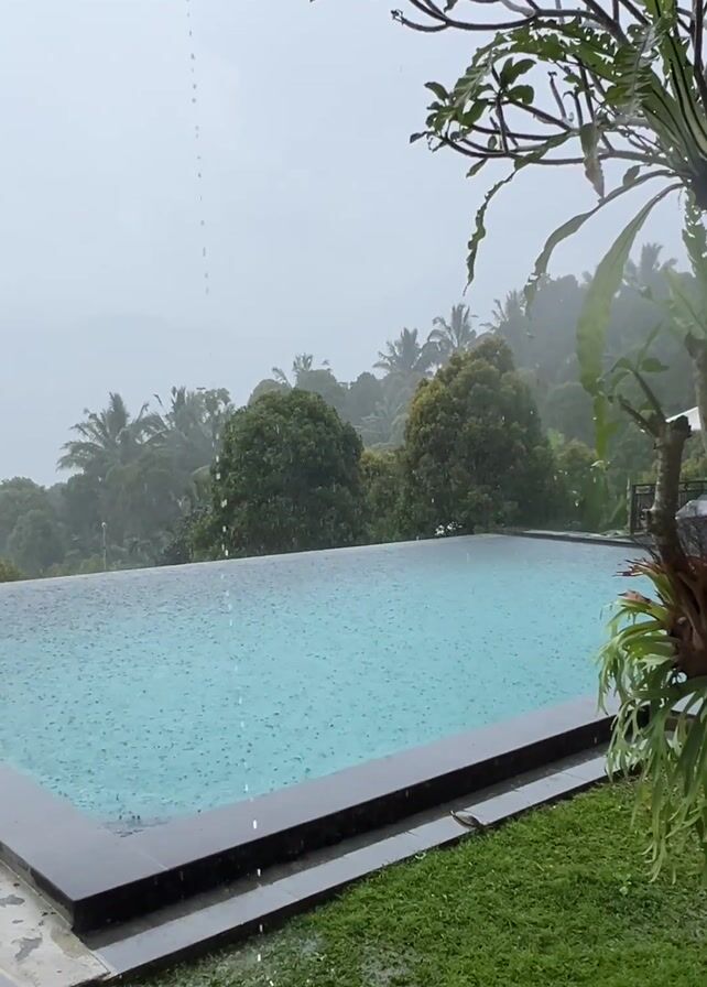 The video depicts a rectangular swimming pool filled with light blue water during a rainstorm. The pool has dark grey or black borders. Surrounding the pool is green grass. In the background, there is a view of dense, lush vegetation, appearing to be a forest or jungle, with a grey, overcast sky above. The camera angle is slightly elevated, and raindrops are visible falling into the pool, creating small ripples on the water's surface. Some branches from a tree or large plant are in the foreground, partially obscuring the view on the right side of the frame.