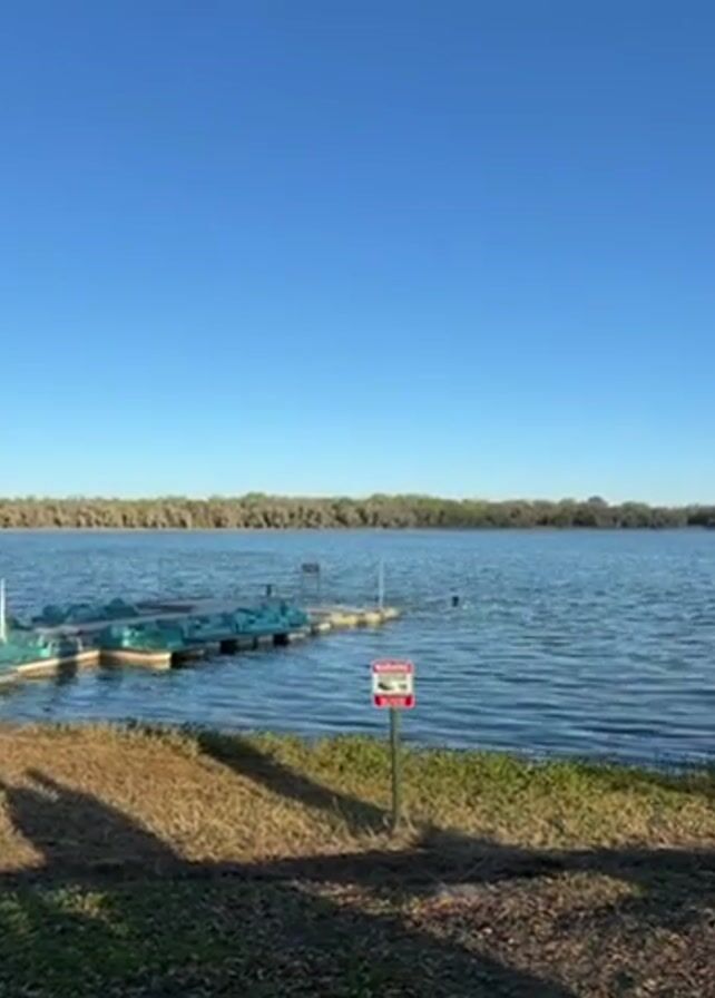 lake scene with a dock and several paddle boats. There are trees along the shoreline and a blue sky. A few seconds into the video, the camera pans to the right and shows a group of people gathered around a picnic table. Some of the people are standing and some are sitting. They appear to be talking and interacting with each other. The setting appears to be outdoors, near a lake. The lighting is bright and the overall atmosphere is casual.