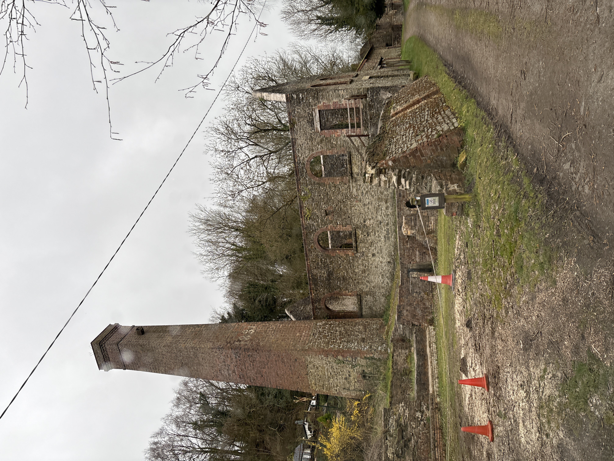 This image depicts the ruins of former industrial buildings at Snailbeach Lead Mine, Snailbeach, United Kingdom, under an overcast sky. The central subject is a tall, reddish-brown brick chimney with a stone base, standing to the left of a larger, partially collapsed stone and brick building. This building features multiple arched openings, indicating former windows or doorways, and its roof is absent. Further remnants of stone and brick walls and foundations are present in the foreground and to the right of the main ruin. No individuals are visible. In the foreground, on a muddy and grassy patch, there are three traffic cones: two small, solid orange cones and one taller, red and white striped cone positioned behind them, secured by a white rope or tape. A wooden post with a small sign attached is visible near the taller cone, but its specific text or imagery is indistinguishable. A narrow, unpaved dirt path extends from the foreground along the right side of the buildings, curving slightly to the right and disappearing into the distance. Bare deciduous trees cover the steep hillsides behind the ruins, and a single black cable or wire stretches diagonally across the upper portion of the frame. A patch of yellow flowering shrubs grows near the base of the chimney. In the far left background, a white building with an outdoor deck and furniture is visible on the hillside.