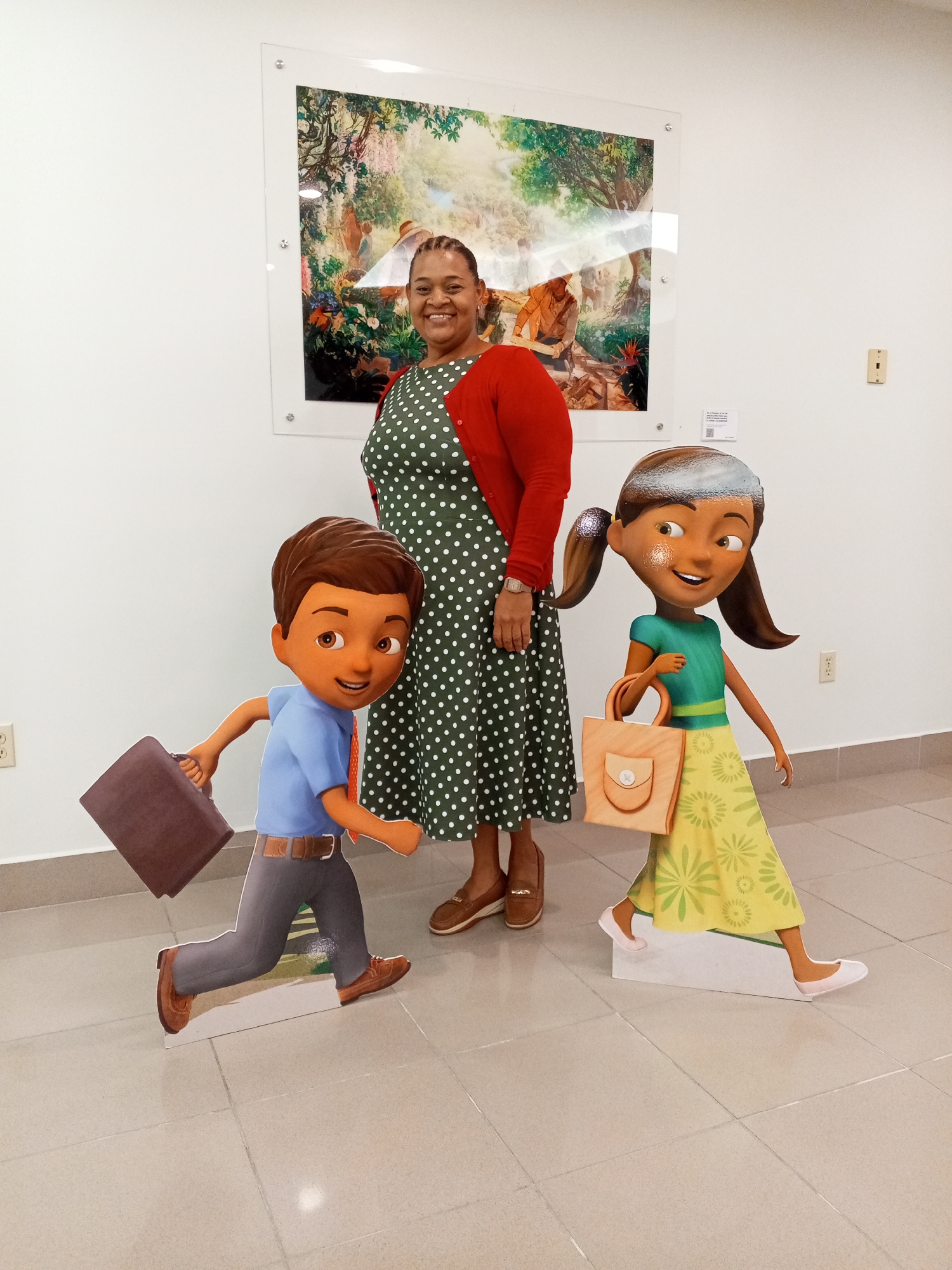 The image captures a woman standing between two cartoon cardboard cutouts of children in what appears to be a public space, likely a library or community center, in La Victoria, Venezuela. The woman is wearing a green dress with white polka dots and a red cardigan. She is smiling and appears to be posing for the photograph. The cardboard cutout to her left depicts a young boy with brown hair, wearing a blue shirt, grey pants, and carrying a brown briefcase. The cutout to her right depicts a young girl with brown hair, wearing a green shirt, a yellow skirt, and carrying an orange purse. Behind the woman hangs an framed painting with images of children working the land. The room is well-lit with white walls and a tiled floor. A wall outlet is visible to the right of the painting. A small sign with QR code is also visible on the painting glass. The overall setting indicates an indoor environment with elements of art and community engagement.