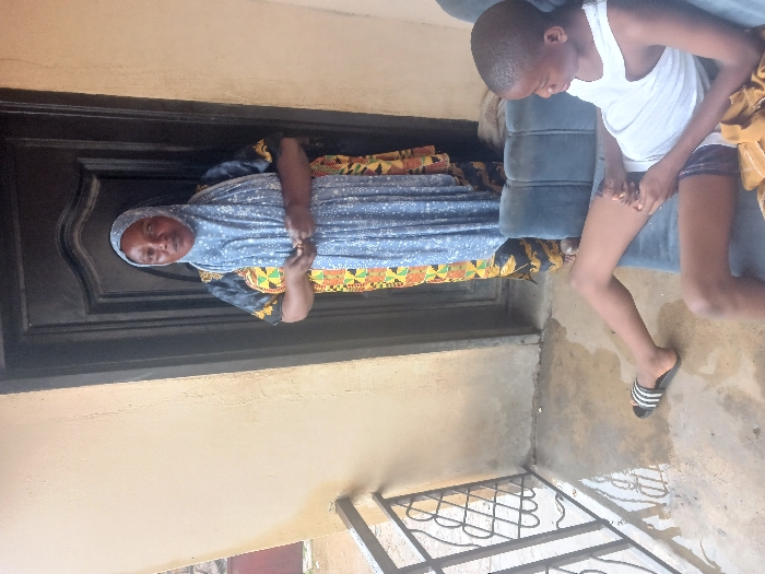 This image, taken in Okene, Nigeria, captures an outdoor domestic scene featuring two individuals. In the background, an adult female with dark skin stands directly in front of a dark, paneled door. She wears a patterned long-sleeved dress in black, yellow, and orange hues, topped with a light blue hijab patterned with white floral motifs. Her hands are clasped at waist level, and she looks slightly to her left. The floor beneath her is concrete. To the left of the woman, a light beige wall is visible, and further left, a dark metal railing with a decorative grid pattern runs vertically. The concrete floor in the foreground and near the railing is visibly wet with puddles. In the right foreground, a young male, appearing to be a child or adolescent, is seated on a blue upholstered armchair. He wears a white sleeveless undershirt and dark shorts. His left foot wears a black and white striped slide sandal, while his right foot is bare. His head is turned to his right, and his gaze is directed downwards towards his clasped hands, which are held near his lap. An orange-brown fabric is partially visible draped over the right side of the armchair.