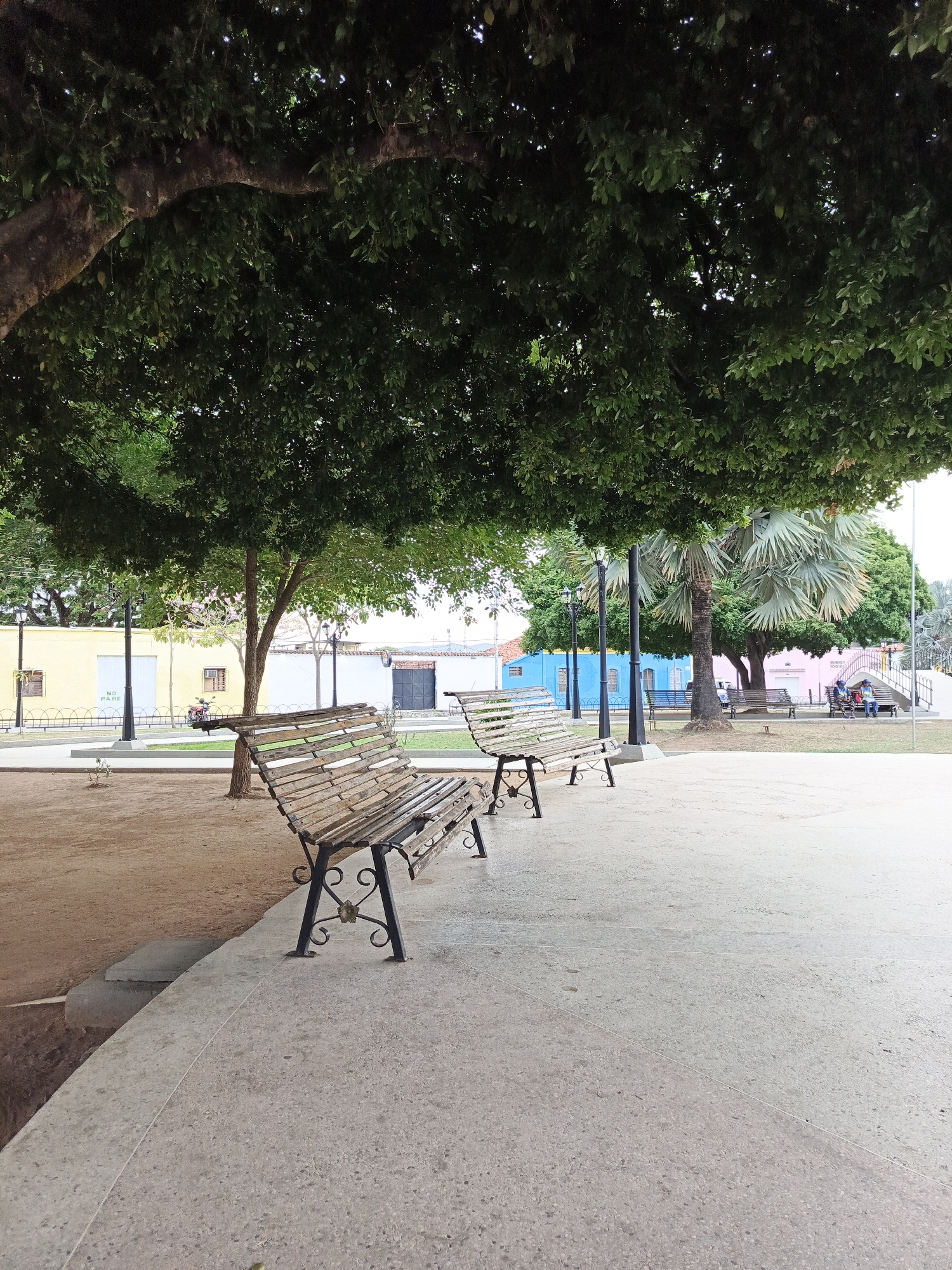 The image captures a serene park setting in Tinaco, Venezuela. Two wooden benches with decorative black metal legs are positioned along a concrete path, shaded by a large, leafy tree overhead. In the background, a row of buildings painted in bright colors – yellow, white, blue, and pink – lines the park's edge. There are lamp posts, trees, and figures further back in the park. A parked motorcycle is visible near the yellow building.
