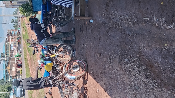 This image depicts an outdoor scene in Chevaywa ward, Kenya, characterized by an unpaved, reddish-brown dirt and gravel ground transitioning to a paved road with urban structures in the background. Two adult males are present in the mid-ground. The male on the left, facing away from the camera, wears a black t-shirt and a dark beanie, standing next to a motorcycle with a yellow and blue fuel tank. His right hand is near the handlebars of this motorcycle. To his left, another partially disassembled motorcycle with a silver front fender and red-rimmed wheel is parked on the dirt. The male on the right wears a black and white long-sleeved shirt, light-colored trousers, dark rubber boots, and a dark cap (possibly brown) worn backwards. His face is partially obscured by a dark covering. He is bent over, leaning on the rear section of a dark-colored motorcycle, seemingly engaged in work or inspection. A wooden bench with a person partially visible (wearing a black and white striped shirt) is at the far right edge of the frame. In the background, a paved road shows a silver van and another vehicle in the distance. Beyond the road, multiple multi-story buildings, utility poles, and sparse vegetation are visible under a partly cloudy sky. The overall scene suggests a roadside motorcycle repair or service area.