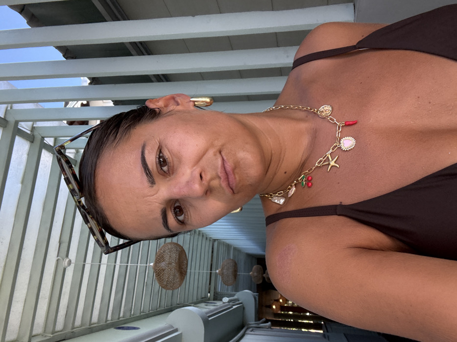 A medium-complexioned woman, appearing to be in her 30s-40s, is the central subject of a close-up photograph taken in Rumassala, Sri Lanka. Her dark hair is pulled back, and tortoiseshell-patterned sunglasses rest on her head. She presents a direct gaze with a slightly furrowed brow and a downturned mouth, indicating a serious or contemplative expression. She wears a dark brown bikini top and gold-toned hoop earrings. A gold-colored chain necklace with various charms, including a white pearl, red cherries, a starfish, a pink heart, and a red chili pepper, is prominently displayed. A reddish mark or abrasion is visible on her left shoulder. The background consists of a light-colored, slatted overhead structure from which three woven, spherical pendant lamps are suspended at varying heights. A light-colored slatted wall is visible to the right, with open sky discernible through the slats, suggesting an outdoor or semi-outdoor setting.