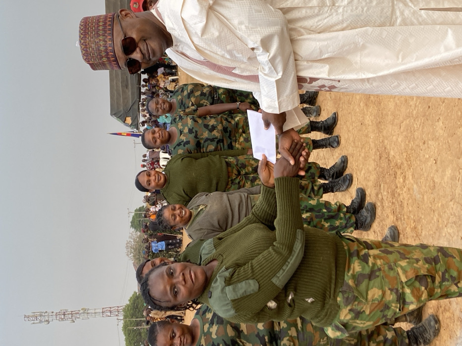 A line of women in camouflage uniforms and black boots stand facing right. A man in a traditional white robe and patterned cap gives one of the women a white envelope. The woman accepting the envelope is smiling. There is a crowd of people in the background. In the bottom left of the frame is a tall metal structure.