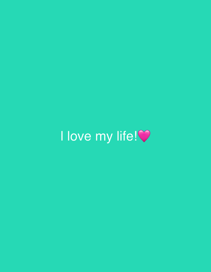 The image displays a plain, solid teal-colored background. Centered horizontally and vertically on this background is white text that reads "I love my life!" A pink heart emoji follows the exclamation mark at the end of the phrase. There are no discernible individuals, physical objects, actions, interactions, or environmental features present within the image. Visual information is insufficient to determine a specific location within Thủ Đức, Vietnam.