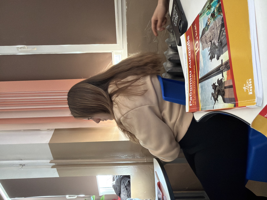 The image depicts an indoor scene, likely a classroom or educational setting, in Panagyurishte, Bulgaria. A young individual with long, light brown hair, wearing a light beige sweatshirt and black trousers, is seated in a blue chair, turned towards the left, looking out a window. Their arms are crossed. To the right, on a white desk, a "Работни Листове по история и цивилизации 10. клас" (Worksheets for History and Civilizations 10th grade) textbook with a red and yellow cover is prominently displayed. The textbook's cover features images of historical monuments, notably the Panagyurishte April Uprising Memorial Complex. Adjacent to the textbook is a black smartphone in a black case with white text visible. A second person's hand is visible in the upper right quadrant, resting near the smartphone. The background shows a two-toned wall, white on top and beige on the bottom, with multiple windows fitted with white frames. One window on the right has a dark roller blind, while another to the left has light-colored vertical blinds. Natural light illuminates the scene from the windows. Below the windows, a metallic radiator is visible. To the far left, a portion of another desk is visible, along with a stack of gray fabric and a small plant near a window.