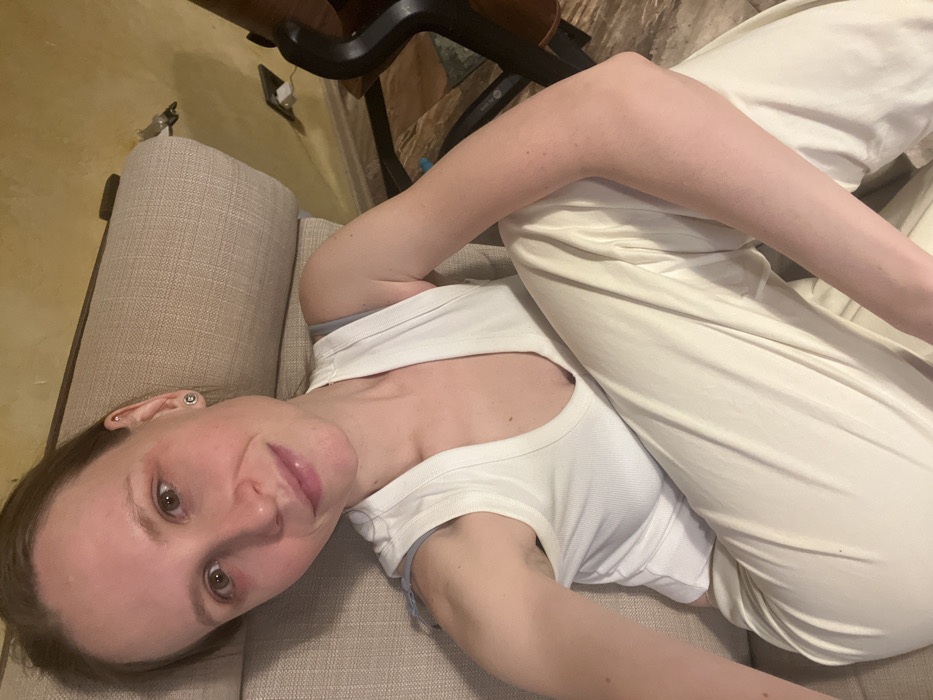A woman reclines on a beige couch, wearing a white tank top and matching pants