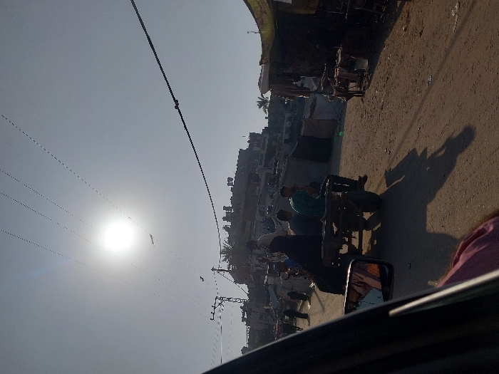 The image captures an outdoor scene in Deir el-Balah, Palestinian Territory, under bright daylight. The perspective is from inside a vehicle, with a dark door frame and a person's arm in a striped sleeve visible in the lower-left foreground. A side-view mirror partially reflects a blurred image. A dirt road occupies the midground, traversed by a rustic, two-wheeled cart. On this cart, one man in a light shirt stands at the front, a woman in a black abaya stands or sits behind him, and two other men are seated on its left side, one in a blue shirt and the other in a green shirt. Shadows from the cart and individuals are sharply cast on the ground to the right. In the background, a density of buildings, some appearing to be residential and others makeshift, are situated on elevated ground. Palm trees are visible among these structures, alongside a utility pole supporting multiple overhead wires that crisscross the sky. A makeshift stall with a green tarp roof is present on the right side of the midground. The sun is prominently featured in the upper-left portion of the clear sky, emitting a strong glare and lens flare.