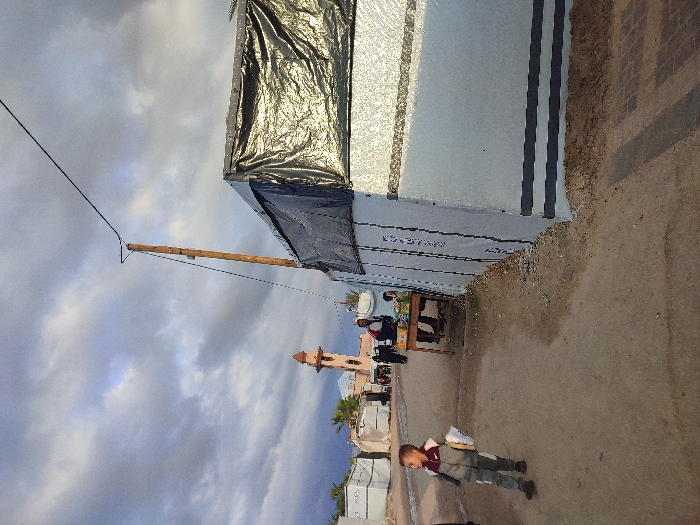 - "A child walks on a dusty path beside temporary shelters with black tarps" by FM-KQSSb2, licensed under CC BY 4.0