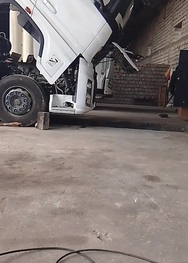 interior of a garage or workshop. A large white truck with its hood raised is parked in the center of the frame. In the background, there is a man sitting on a stool facing away from the camera. To the right, there is a table covered with a red cloth. A variety of car parts are scattered on the table and around it. A second man is sitting on the floor with his head in his hands. The garage walls are made of white brick. There are several objects hanging on the wall, including black plastic bags and a small red object. The floor is concrete. The overall impression is that the space is cluttered and used for mechanical work.