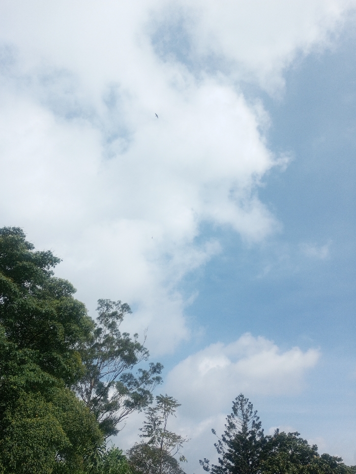 A daytime outdoor scene in Đăk Pxi, Vietnam, features a light blue sky with numerous white cumulus clouds. The upper left quadrant of the sky contains a small, dark avian silhouette in flight, positioned above a smaller, indistinct dark speck. The lower portion of the image is occupied by the upper canopies of multiple trees; dense green broadleaf foliage fills the lower left, while sparser trees, including what appears to be a conifer, are visible on the lower right against the sky.