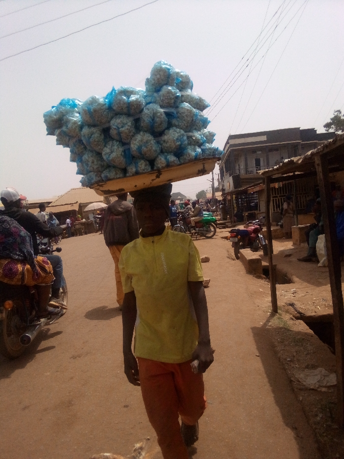 The image displays a street scene in Barakin, Nigeria, under a hazy daylight sky. In the foreground, a person, likely male, with dark skin, wearing a yellow short-sleeved shirt and orange trousers, walks forward, carrying a large, flat, light-colored tray on their head. The tray is densely packed with numerous small, spherical items, each enclosed in a light blue plastic bag. To the left, a portion of a person on a motorcycle, wearing a white cap, is visible. The ground consists of an unpaved, reddish-brown dirt road with visible tracks. In the mid-ground, other individuals are present, some walking, others near or on motorcycles. On the right, rudimentary market stalls or shelters constructed from wood and corrugated metal line the street. Beyond these, a multi-story building with a darker facade and multiple windows is prominent. Overhead, multiple thin power lines crisscross the sky.