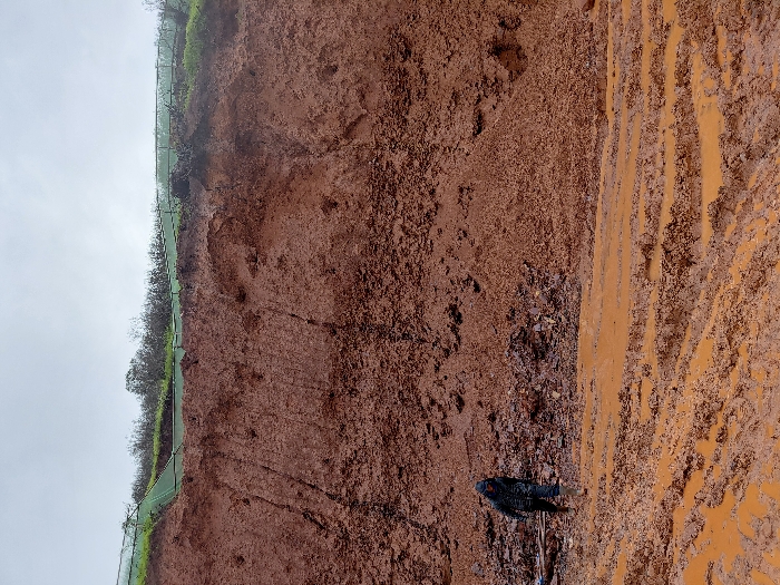 A reddish-brown clay slope is shown with exposed earth and a path of muddy runoff. Green netting and sparse vegetation line the top of the slope. A figure in dark clothing stands at the base of the slope, appearing to be near some equipment. The scene appears overcast, and the ground is damp, suggesting recent rain. The slope's material consists of varying textures, from fine dirt to scattered pebbles.