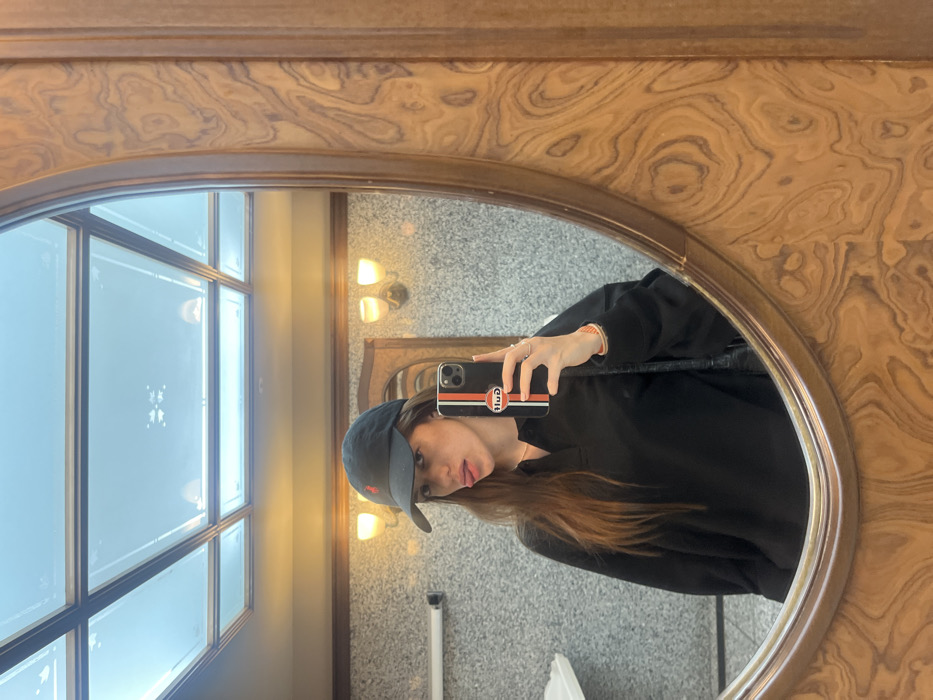 A female individual is depicted in a mirror selfie taken indoors within the Chersonisos Municipal Unit, Greece. The subject, viewed from the chest up, wears a dark baseball cap with a red logo and a dark, long-sleeved polo shirt. Her long brown hair is visible. She is sticking her tongue out. Her right hand, adorned with a light-colored bracelet and a ring, holds a black smartphone featuring a "Gulf" branded case with orange and blue stripes and a triple rear camera setup. The mirror is oval-shaped, framed by wide, light-brown wood with a distinct swirling grain pattern. The background, reflected in the mirror, consists of a light grey speckled wall. Two brass-toned wall sconces, each with two frosted glass shades, illuminate the space. A white sink or counter fixture is partially visible on the left. Above the subject's head, a multi-paneled glass ceiling or skylight is reflected. A wooden door with an arched top is partially visible to the right.