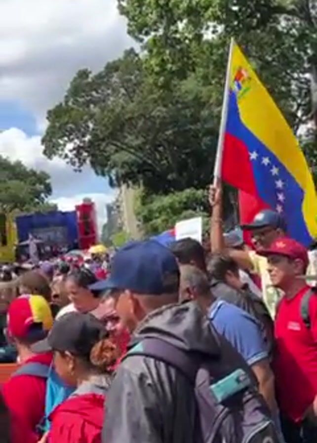 large crowd of people marching down a street. Many people are wearing hats and jackets. A person in the crowd holds up a Venezuelan flag. The crowd is heading towards a stage that is visible at the end of the street. Many people are holding signs, but the writing is not discernible. The crowd is walking on a paved street lined with trees and buildings. The sky is cloudy. A traffic light is visible in the background.