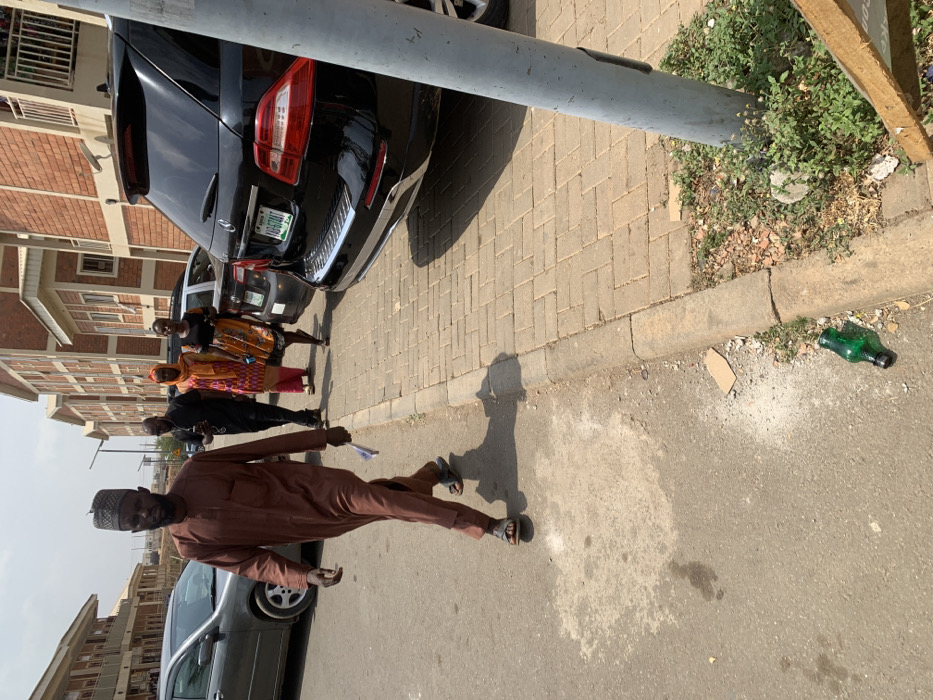 The scene depicts a street in Abuja, Nigeria, under bright daylight conditions, indicated by distinct shadows