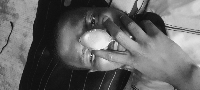 A black and white, close-up, portrait-oriented image depicts an adult male looking directly at the camera. He has a dark complexion, short dark hair, and facial hair. His right hand is positioned in front of his face, holding a smooth, light-colored, ovoid object, consistent with an egg, against his forehead between his eyes, partially obscuring his nose. He is wearing a light-colored garment with vertical dark stripes visible on the right side of the frame. The background consists of a dark, striped fabric on the left and a lighter, textured surface with a thin, dark, wavy line on the upper right, suggesting an indoor, casual environment. The specific location in the city of Toto, Nigeria, cannot be determined from the visual evidence present in the image.