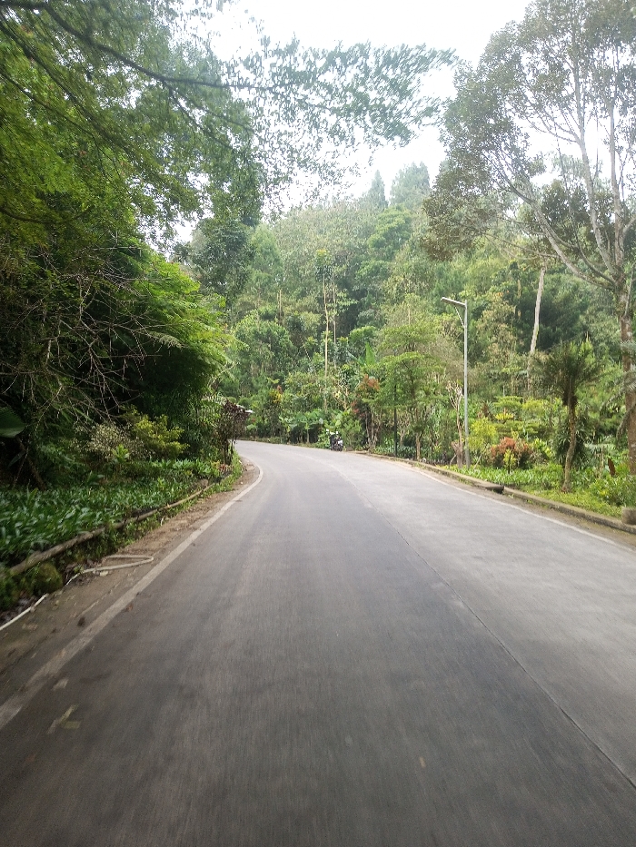 A grey asphalt road curves gently through a lush, green landscape. Dense vegetation, including various trees and plants, lines both sides of the road. A lamppost stands on the right side of the road, amidst the greenery. Further ahead, a small motorcycle is parked along the road's edge. The sky above is overcast, casting a soft, diffused light over the scene.