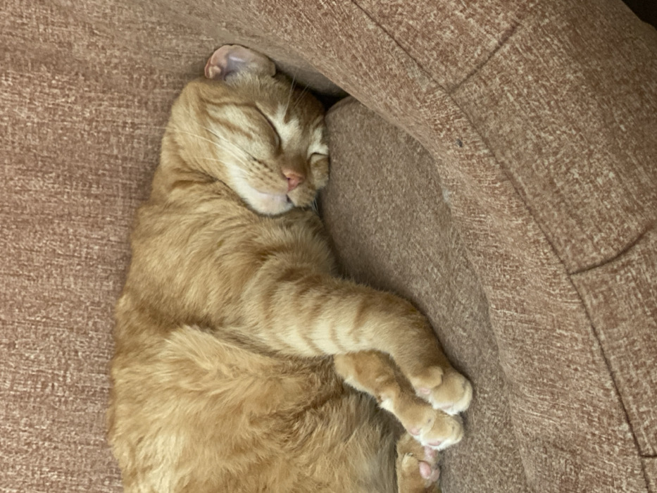 - "An orange tabby cat with striped fur is observed sleeping soundly on a textured, light brown upholstered piece of furniture, likely a sofa or armchair" by FM-uK62y1, licensed under CC BY 4.0
