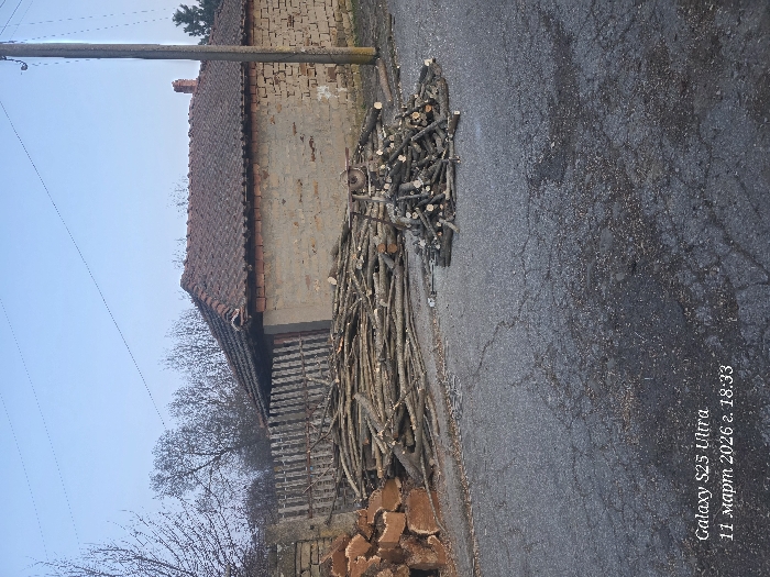 The image depicts an outdoor, static scene in Dolna Beshovitsa, Bulgaria, captured on March 11, 2026, at 18:33 by a Galaxy S23 Ultra device. The foreground consists of a cracked and worn asphalt road surface, sparsely scattered with wood chips and sawdust. Two accumulations of cut wood are present on this surface. To the left, a larger, elongated pile of diverse branches and logs extends horizontally. To the right, a smaller, conical pile of shorter, more uniformly cut wood pieces is situated. A small, two-wheeled handcart is partially visible, resting within the larger wood pile. In the midground, a weathered wooden picket fence stands between the road and a single-story building. The building features a facade of mixed construction, appearing to combine sections of brickwork with areas of what resembles rendered or mud-brick material. It is topped with a sloped roof composed of terracotta tiles, and a brick chimney stack is visible on the roofline towards the right. Bare deciduous trees are positioned behind the fence and the building, indicating a late winter or early spring environment. The background shows a clear, pale blue sky with faint overhead power lines traversing the frame. A tall, dark wooden utility pole is prominently situated on the right side of the image, extending upwards beyond the roofline of the building. A coniferous tree is partially visible on the far right edge of the frame. No individuals or active interactions are present in the scene.