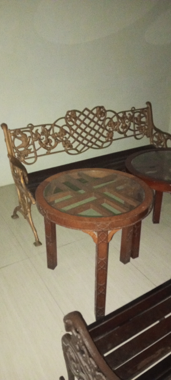 The scene depicts an interior or semi-enclosed space in Aral, Kyrgyzstan, featuring outdoor-style furniture. In the foreground, a dark brown wooden bench with a slatted seat and ornate dark metal arms is partially visible at the bottom right. Directly in front of a light-colored wall, a decorative garden bench with a gold-colored, intricately scrolled and latticed metal backrest and matching legs stands. Adjacent to this bench, positioned centrally, is a round wooden table with a glass top. Beneath the glass, a geometric pattern of light-colored wood or inlay against a darker, possibly green, background is visible. This table has four carved wooden legs. To the right of the central table, a portion of another similar round table with a dark top is present. The floor is covered with light-toned rectangular tiles. No individuals are present, and no specific actions or interactions are occurring. The lighting is dim and artificial.