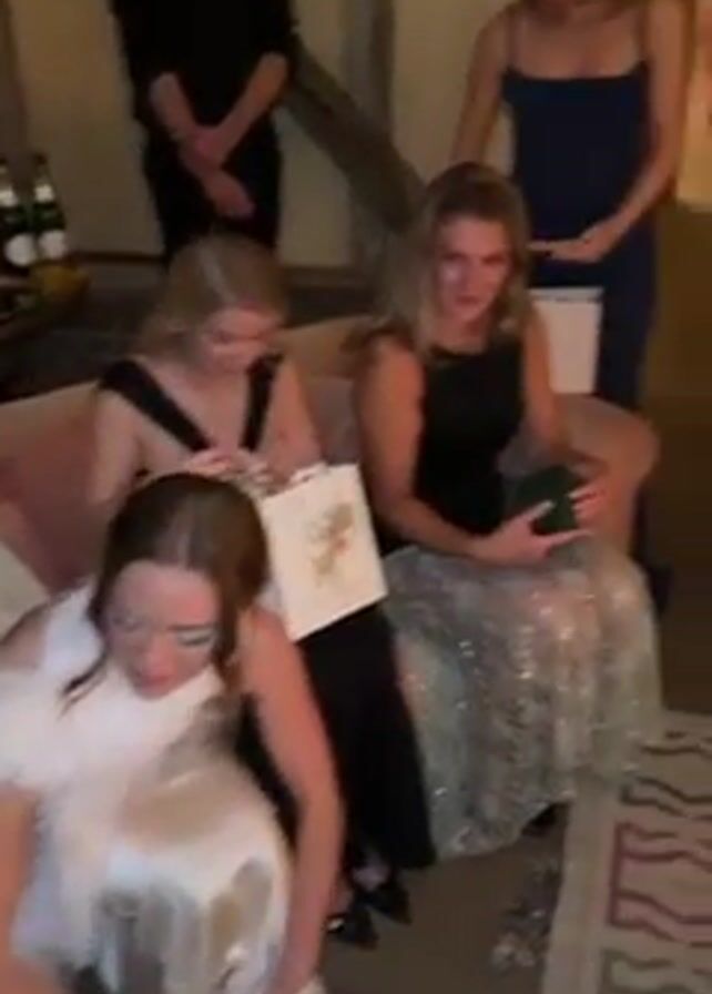 A group of approximately 13 people are gathered indoors in what appears to be a festive setting, possibly a party or a gathering. Most of the women are dressed in formal attire, like dresses, while the men are in more casual wear. The group is in a room with a visible fireplace and a wooden beamed ceiling, suggesting a rustic or traditional building. They are opening gifts. There are gift bags and wrapping paper scattered around, as well as some floral decorations. Some people are seated on chairs or sofas while others are standing. The atmosphere is lively and social.