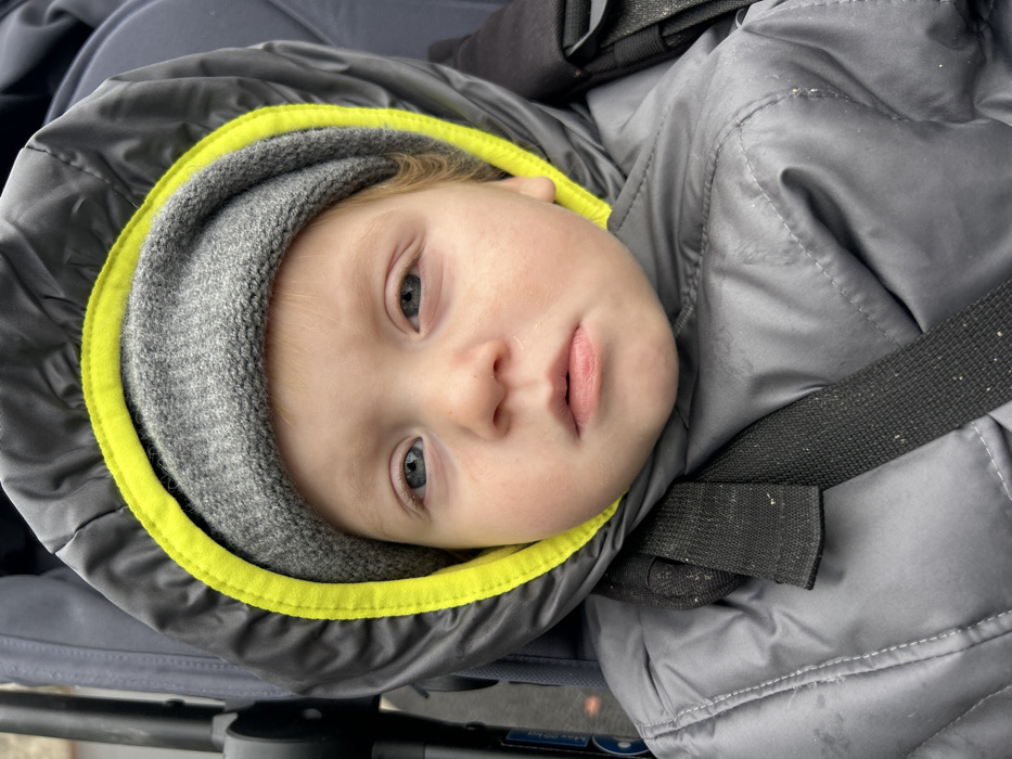 - "A young child is depicted in a close-up, chest-up shot, seated and secured within a dark-colored stroller or carrier, observed in Erba, Italy" by FM-fbqYv1, licensed under CC BY 4.0