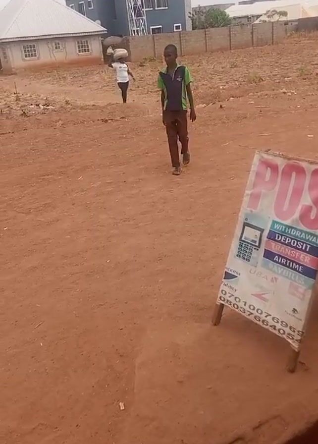 dirt lot in front of a few buildings under a cloudy sky. A young person in a green and purple shirt and brown pants is walking toward the camera. Behind them, another person in a white shirt appears to be carrying something on their head. In the foreground, there is a sign that says "POS" and lists financial transactions like "withdrawal, deposit, transfer, airtime, pay bills" along with phone numbers and bank logos. The camera is somewhat shaky.