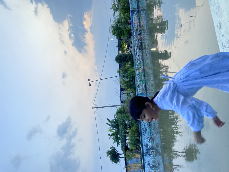 An outdoor scene in Kalitengah, Indonesia, depicts a young female in the immediate foreground, positioned to the right of the frame, leaning forward with her arms raised and bent at the elbows, hands slightly cupped