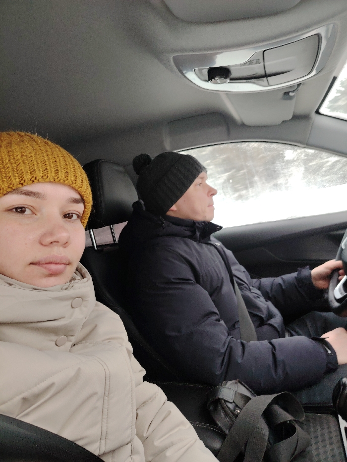 The image depicts two individuals inside a vehicle, located in Markovo, Russia. A female is seated in the front passenger seat, wearing a mustard yellow ribbed knit beanie and a light beige puffer jacket with visible button closures, directly facing the camera. To her right, a male, identified as the driver, wears a dark grey knit beanie with a pom-pom and a dark blue puffer jacket. He is observed looking forward and slightly right, with both hands on the steering wheel. Both individuals are secured by dark-colored seatbelts. The vehicle's interior features a light grey headliner with an overhead console unit and dark-colored seats. A dark strap or bag is visible on the center console area between the two occupants. Through the vehicle's windows, a snow-covered or wintery landscape with indistinct trees is visible, consistent with cold weather conditions.