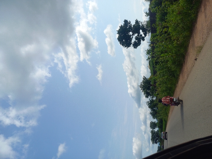 The image depicts a rural or semi-urban road scene in Akwanga, Nigeria, viewed from inside a vehicle, with a dark frame element visible on the lower left. The sky occupies the upper two-thirds of the frame, displaying a light blue hue with numerous scattered white cumulus clouds. A two-lane asphalt road extends into the distance, with a narrow, reddish-brown dirt shoulder on its right. A single individual, clad in a red and white patterned long-sleeved garment, rides a light-colored motorcycle away from the viewer on the right side of the road. Further down the road, a light-colored sedan is visible, also traveling in the same direction. The right side of the road is bordered by dense green bushes and smaller trees, with several larger, dark green trees forming a treeline in the mid-ground and a prominent, broad tree standing alone on the right horizon. More trees are visible in the distant left. The overall environment suggests an open landscape with significant natural vegetation.