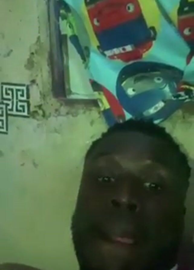 A close-up, eye-level shot features a person with dark skin, a short haircut, and a beard, looking directly at the camera. They briefly stick their tongue out and then close their mouth. The background includes a wall with peeling paint and a small window covered by a light blue curtain patterned with cartoon vehicles and characters. To the left of the window, decorative Greek key patterns are attached to the wall. The scene appears to be lit with a green tint.