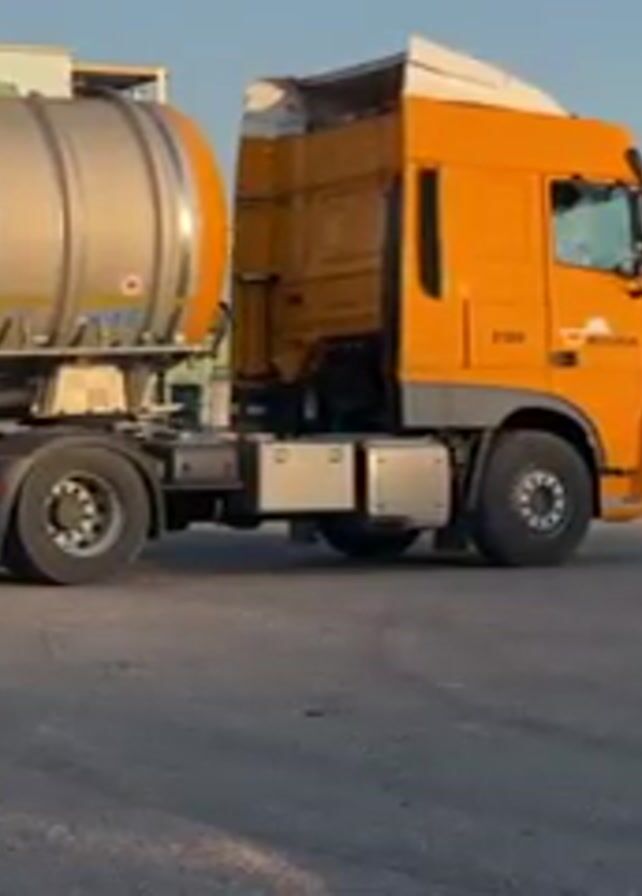 An orange semi-truck towing a silver tank trailer sits stationary on a gray asphalt surface. The truck is facing towards the right, displaying "2100" and "Mouwrik" on its side. The trailer is connected to the truck and features warning labels on its side. In the background, cargo cranes can be seen against a clear blue sky. To the right of the truck, pallets of green metal are stacked. The surface appears to be a loading or storage area within a port or industrial complex.