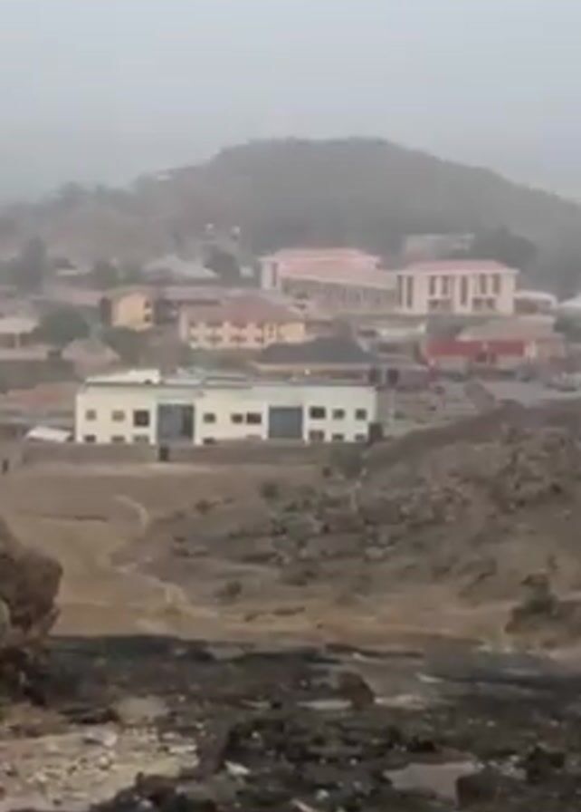 cityscape from a high vantage point on a foggy or hazy day. Several buildings are visible, including a white rectangular one and some larger, pink-toned buildings with red roofs. The foreground consists of rocky terrain with sparse vegetation. A road runs through the middle ground, and vehicles, including cars and motorcycles, can be seen moving along it. The overall scene is somewhat obscured by the fog or haze, giving it a muted and indistinct appearance.