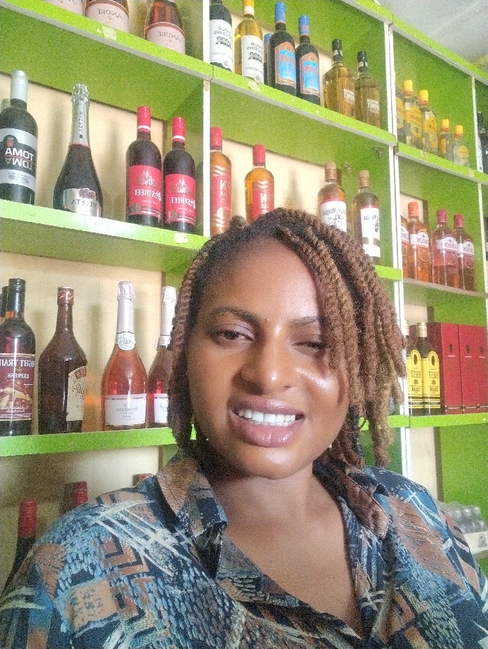 An adult female is depicted in a close-up, chest-up portrait within a retail setting in Barden Yana, Nigeria