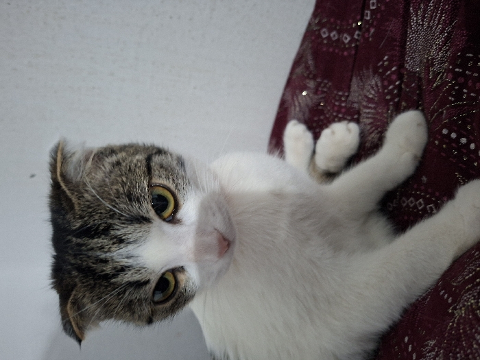 A domestic cat is depicted sitting indoors in the city of Khujayli, Uzbekistan