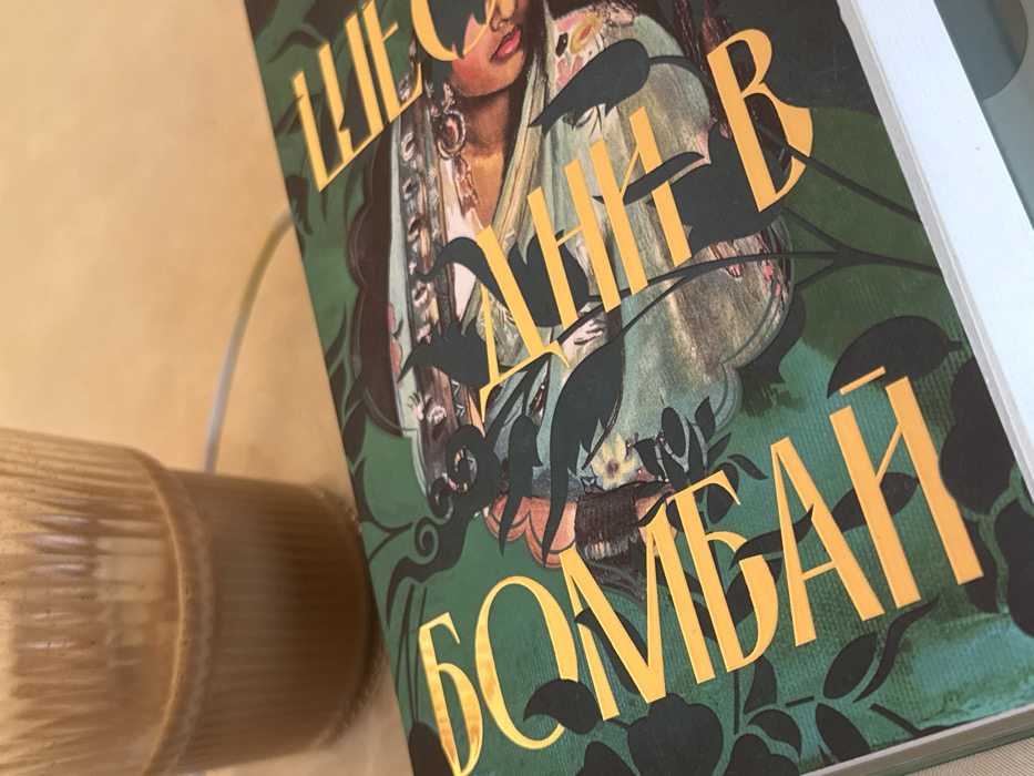 The scene depicts a close-up, high-angle view of a book and a beverage on a light-colored surface, presumably located in the city of Suvorovo, Bulgaria. No individuals are present. The primary subject is a book with a dark green cover featuring gold/yellow embossed text, partially legible as "BOMBAY" on the left and "THE RIVER" on the right. The cover illustration includes dark green foliage patterns, ornate elements, and the partial depiction of a woman's face adorned with what appears to be jewelry or a headdress. Adjacent to the book, a clear, vertically ridged glass contains a light brown, opaque liquid with a layer of foam on its surface, consistent with a milky coffee beverage. The items rest on a smooth, light brown or beige table surface. A thin, white or light-colored cable is visible on the table, extending from behind the glass towards the book. The lighting is uniform, suggesting an indoor setting.
