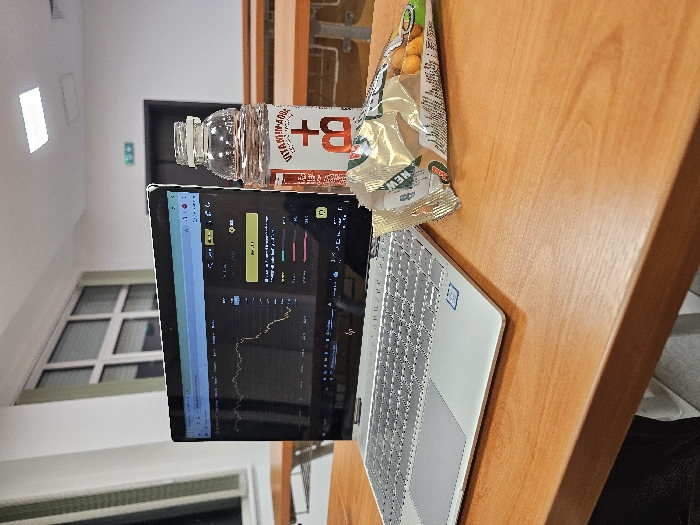 The image displays a personal workstation set up on a light brown wooden table within an indoor institutional environment, identified as likely a classroom, lecture hall, or study room in Sofia, Bulgaria. A silver HP laptop is open, positioned to the left, and its screen shows a dark-themed interface with a prominent downward-trending line graph, characteristic of a financial or cryptocurrency trading platform. To the right of the laptop, an upright, clear plastic bottle of "VITAMIN AQUA B+" stands. Adjacent to the bottle is an opened, crumpled snack bag, partially revealing the text "MEN" on its packaging and containing small, round items, possibly nuts. In the background, multiple similar wooden tables with white metal frames are visible, arranged as if in a classroom. A large multi-paned window spans the left wall, admitting ambient light. On the right, a dark, closed door is visible, with a green illuminated "EXIT" sign positioned directly above it. The ceiling features recessed rectangular fluorescent lighting fixtures. No individuals are present in the frame, but the arrangement suggests recent or ongoing use. The presence of the "VITAMIN AQUA B+" brand, a known Bulgarian product, indicates the location is within an educational or study facility in Sofia, Bulgaria.