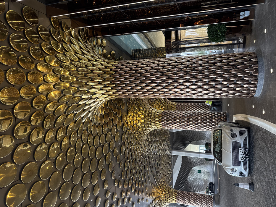 The image displays the luxurious porte-cochère of the Morpheus Hotel at City of Dreams, Macao. The overhead ceiling is covered entirely with countless reflective, circular, gold-toned metallic plates arranged in a dense, overlapping pattern. Supporting this canopy are several large, distinctive columns, each textured with elongated, scale-like metallic elements transitioning from a bronze-copper hue at the base to gold at the top, creating an organic, tree-like appearance. The ground is paved with dark grey interlocking pavers. A white Bentley Continental GT with Macao license plates "ZN 7144", "AC-67-89", and "ZF-FE-99" is parked prominently in the foreground, angled slightly left. A black and orange traffic cone stands on the pavement near the Bentley's front left wheel. To the far right, a glass-fronted building entrance is visible, adjacent to a large potted green plant. One individual, wearing a high-visibility yellow-green vest and dark trousers, is partially obscured behind one of the columns on the right, facing away from the viewer. A second, darker vehicle is partially visible in the background on the left. The scene is brightly lit by integrated artificial lighting, accentuating the metallic surfaces and creating numerous reflections.