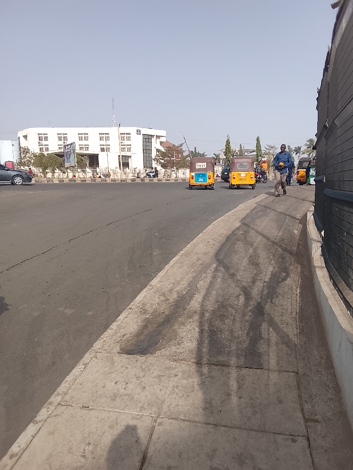 This image depicts a daytime street scene in Maiburiji, Nigeria, characterized by an urban environment with vehicular and pedestrian traffic. In the foreground, a concrete sidewalk, marked by dark stains and extensive shadow patterns from an unseen overhead structure, extends from the lower right towards the middle ground. To the immediate right of the sidewalk, a dark mesh or lattice fence is partially visible. The middle ground is dominated by an asphalt road, exhibiting a longitudinal crack running down its surface. Several vehicles are present: two yellow and blue Bajaj RE three-wheeled auto-rickshaws (tuk-tuks) are positioned in the right lane, moving away from the viewer. The rear tuk-tuk displays "LAG 100" on its back. Another yellow tuk-tuk is further down the road. A grey sedan, possibly a Toyota, is visible on the far left side of the road, partially obscured. A lone adult male is walking on the asphalt road, right of the center lane, wearing a blue long-sleeved shirt and light-colored trousers. He is carrying a yellow or orange object in his left hand. His long shadow stretches across the sidewalk. In the background, on the left, a multi-story white building with numerous windows and a blue logo or sign on its facade is prominently situated behind a traffic island or median. This island features a low curb and sparse, small trees. A large white tank or structure is visible to the left of the building. The sky is clear and light blue, indicating strong daylight conditions, as evidenced by the distinct shadows cast by subjects and objects. Further down the road, additional vehicles and indistinct figures are visible.