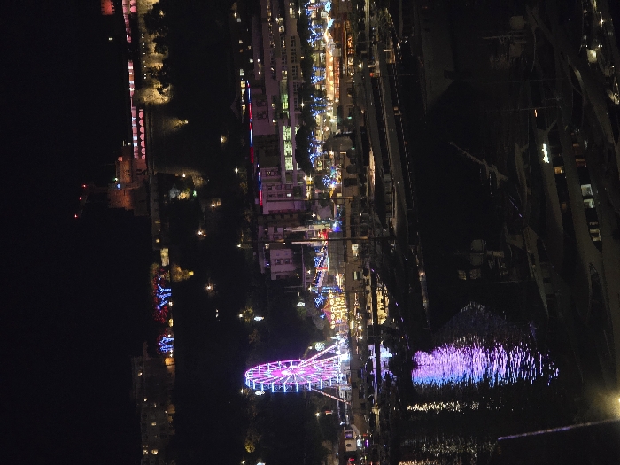 The image displays a nighttime panoramic view of Port Hercule in Monaco, Monaco. The foreground presents a dark body of water, reflecting numerous artificial lights from the shore and structures. Multiple large yachts and smaller boats are moored in the harbor, appearing as dark silhouettes with scattered internal and deck lights. In the midground, directly across the water, an illuminated amusement area is visible. A prominent Ferris wheel, lit in vibrant pink and purple, stands as a central feature, its reflection clearly visible on the water's surface. Adjacent to the Ferris wheel, additional fairground rides and stalls are adorned with diverse colorful lights. Behind these attractions, multi-story urban buildings line the waterfront, displaying illuminated windows and exterior lighting. The background is dominated by the Prince's Palace of Monaco, situated atop a prominent rock formation. The palace complex is extensively illuminated with warm orange light, accentuating its architectural details and perimeter walls. A construction crane, marked with red at its tip, is visible above the left section of the palace structure. Trees and landscaping on the hillsides leading to the palace are decorated with festive blue and red lights. The sky is dark, indicating a clear night. No individuals are discernible within the frame.