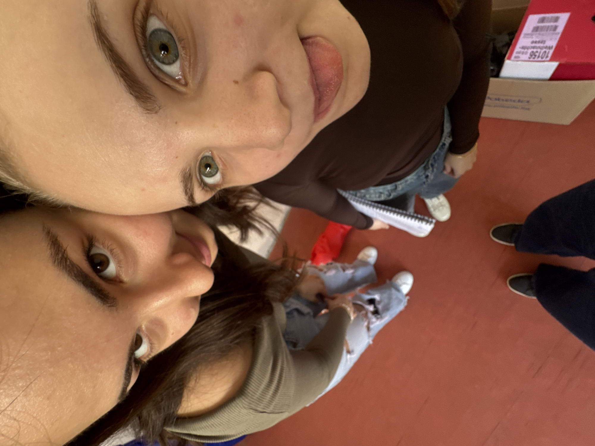 An overhead-angle photograph depicts two young females and the lower extremities of a third individual on a reddish-brown floor