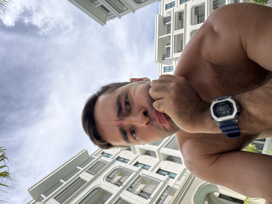 A man takes a selfie outdoors. He has dark hair, brown eyes, and is shirtless. He holds his hand up to his face in a fist, looking at the camera with a slight smirk. A digital watch is on his left wrist. Behind him are buildings with balconies and a cloudy sky. Some green foliage is visible in the lower left corner. The photo is taken from a low angle, tilted upwards.