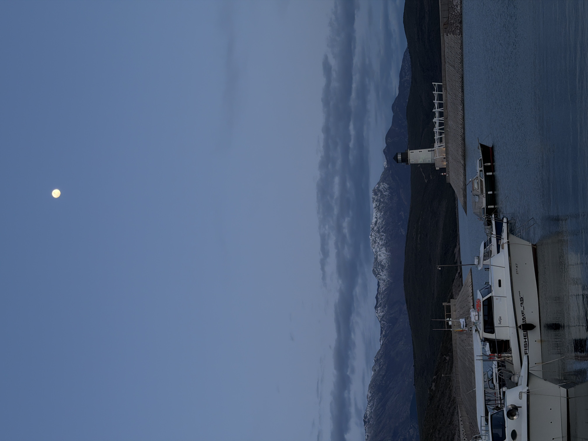 An evening scene in Radovići, Montenegro shows a docked fishing boat. A lighthouse sits on the concrete pier. Mountains are in the background, with a few snowcaps visible. The moon is visible in the sky. The water is a dark blue.