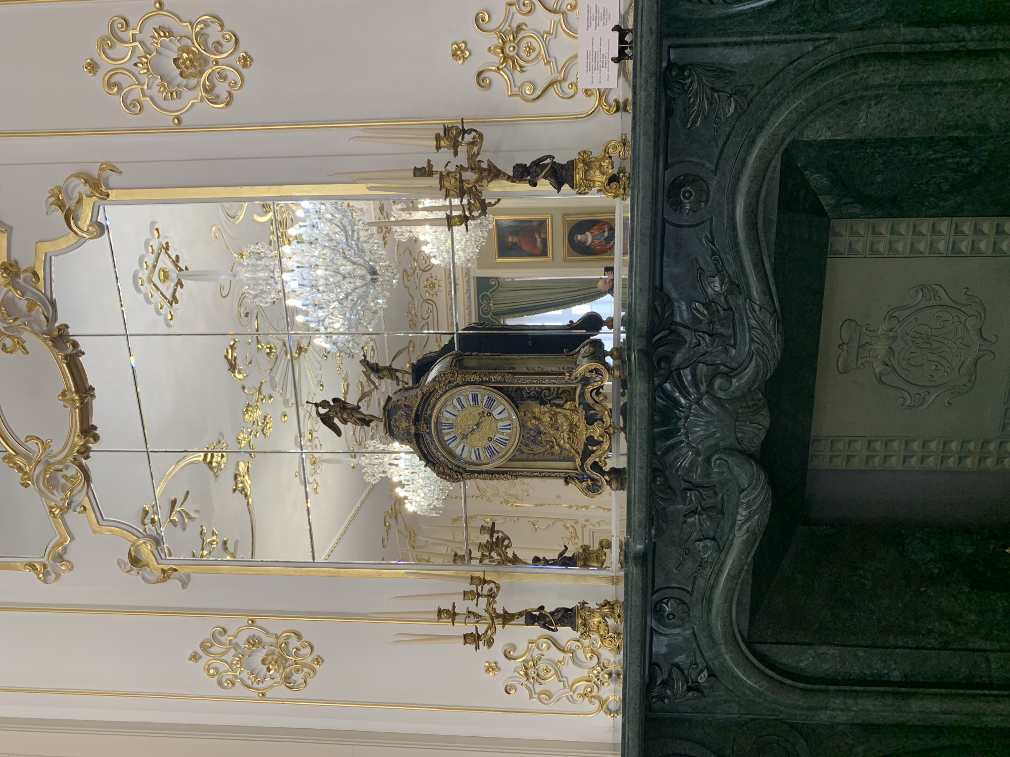 The image depicts an opulent interior within the Mir Castle Complex, located in Mirsky Sel'sky Sovet, Belarus. The central focus is a grand, dark green polished marble fireplace mantelpiece featuring intricate carved decorative elements, including shells, leaves, and floral motifs. The firebox opening is dark, revealing a light-colored interior panel adorned with a crowned "MR" monogram. Resting on the mantelpiece are three ornate items. In the center is a large, dark-colored mantel clock with extensive gilded bronze ornamentation, including mythological figures and scrollwork. A golden winged figure stands atop the clock. The clock face is round, featuring blue Roman numerals on a white inner ring and a gold center. Flanking the clock are two identical gilded three-branched candelabras, each holding three upright white taper candles. The base of each candelabra features a dark statuette, possibly a putto or cherub. To the right of the right candelabra, a small informational sign written in Cyrillic rests on a miniature wooden easel. Above the mantelpiece is a tall, segmented mirror composed of multiple rectangular panes, framed by a highly ornate, gilded border with elaborate Rococo-style scrollwork and floral designs. The mirror reflects a grand room beyond the immediate view, including multiple crystal chandeliers with numerous lit bulbs, indicating a high ceiling. Also visible in the reflection are two framed portrait paintings: an upper painting of a man in a red hat and a lower painting of a woman in formal attire and a crown. Green drapery is visible to the left of the reflected paintings. A partial reflection of an adult individual, identified by a dark shirt and a hand holding a mobile phone, is visible in the lower right segment of the mirror, suggesting a visitor capturing an image of the scene. The surrounding walls are light-colored, possibly white or cream, adorned with vertical gilded decorative trim and ornate gilded appliqués featuring intricate floral and scroll patterns. The overall scene conveys a sense of historical grandeur and elaborate classical design.