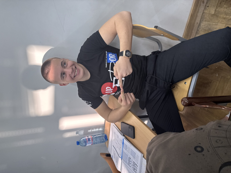 The scene is an indoor classroom or lecture hall, identified as being in Sofia, Bulgaria, based on the presence of a DEVIN brand water bottle