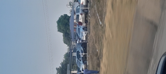 A row of parked cars stretches along a building with a dark awning. A man walks near the front of the vehicles. A tree rises behind the building. Overhead power lines stretch across a light blue sky. The foreground is a blurred brown surface, possibly a road. The image is slightly out of focus due to motion.