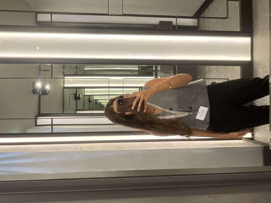 A person is depicted in a mirror selfie within an indoor, modern environment located in Lordelo do Ouro e Massarelos, Portugal. The subject, a person with long, wavy brown hair, has their face obscured by a smartphone in a brown case, held by their right hand to capture the reflection. They are wearing a light grey, sleeveless, collared vest with three dark buttons, black trousers, and a white lanyard with an attached identification badge around their neck. A dark necklace and a simple gold-colored bangle on their left wrist are also visible. The background consists of a series of dark-framed vertical mirrors separated by panels containing bright, vertical strip lighting, creating an infinite reflection effect. Reflecting in the mirrored ceiling, two dark, square-shaped overhead light fixtures are visible. The visible floor surface is composed of dark tiles.