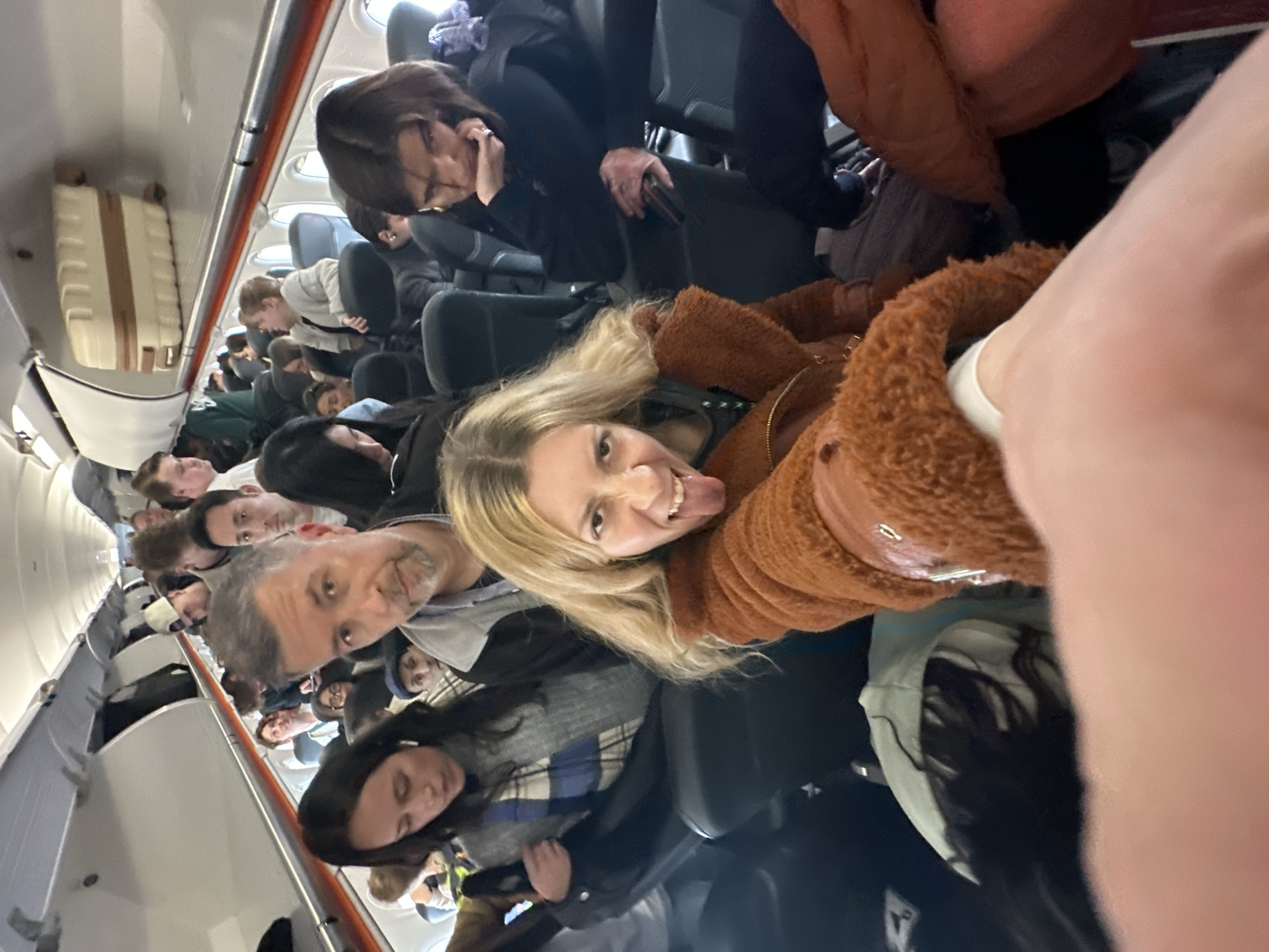 interior of an airplane. Passengers are seated in rows. A blonde woman is looking directly at the camera, sticking out her tongue. A man with grey hair is beside her, also looking at the camera. Other passengers are visible in the background. Luggage is stowed above the seats. No information indicates the location to be Schiphol, Netherlands.
